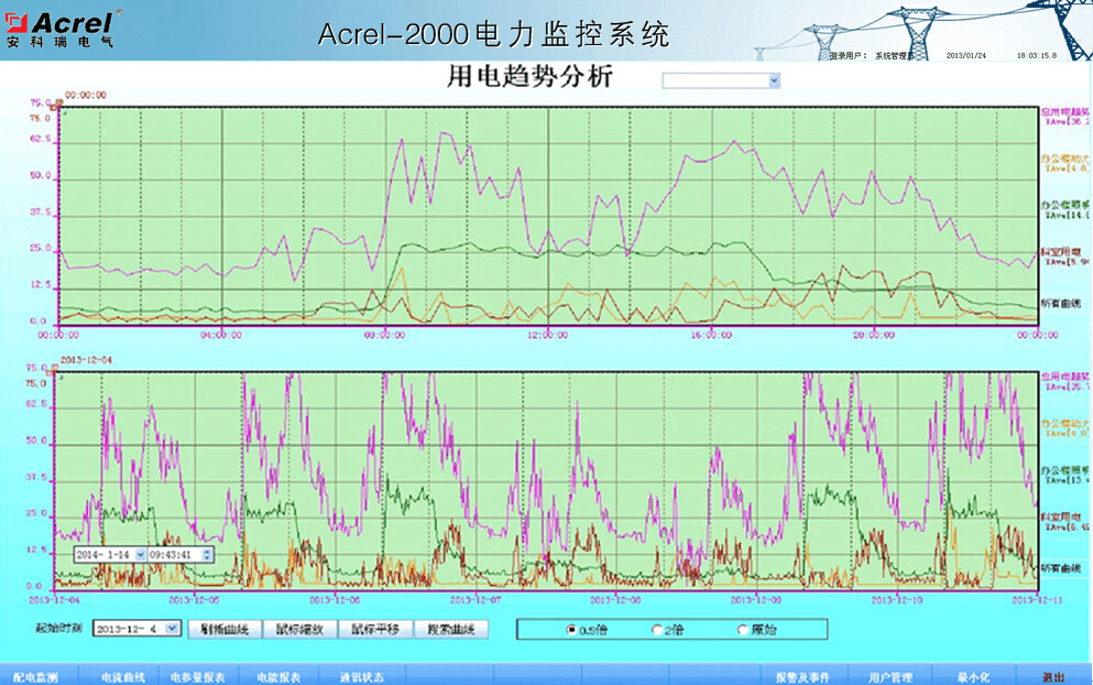 安科瑞Acrel-2000电力监控系统对配电系统总进线回路(或重要负荷的出线)设计了负荷趋势曲线。便于配电维护人员及时掌握用电需求与供电系统负荷占比,确保供电可靠性,为用户单位的用能权益提供保障。借助该功能,还可分析用能需量的增长趋势,适时调整需量申报,减少因需量偏差过大造成的多余缴费。